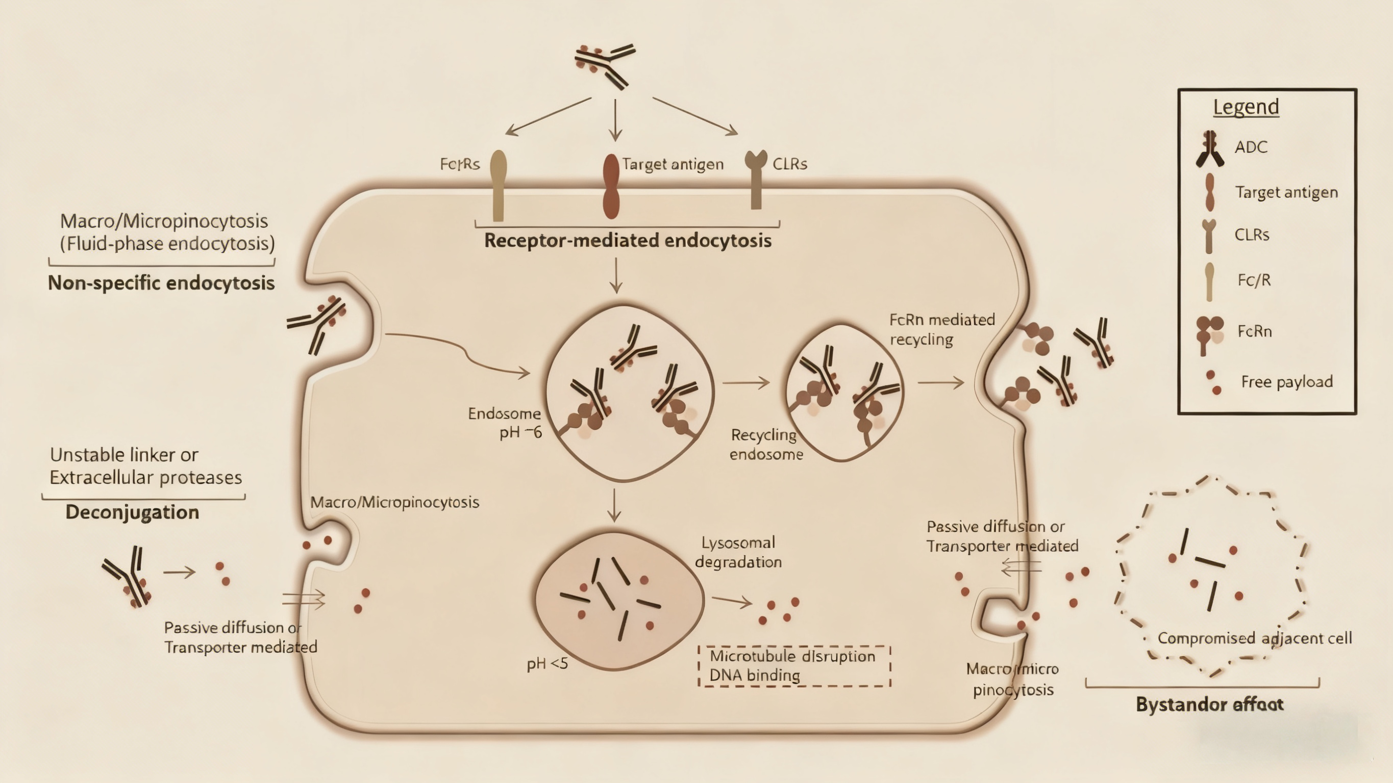 ADC的理化性質(如表面電荷、疏水性)也會影響其非特異性內吞速率。正電荷或高疏水性的ADC更易與細胞膜相互作用,增加非靶向攝取風險。