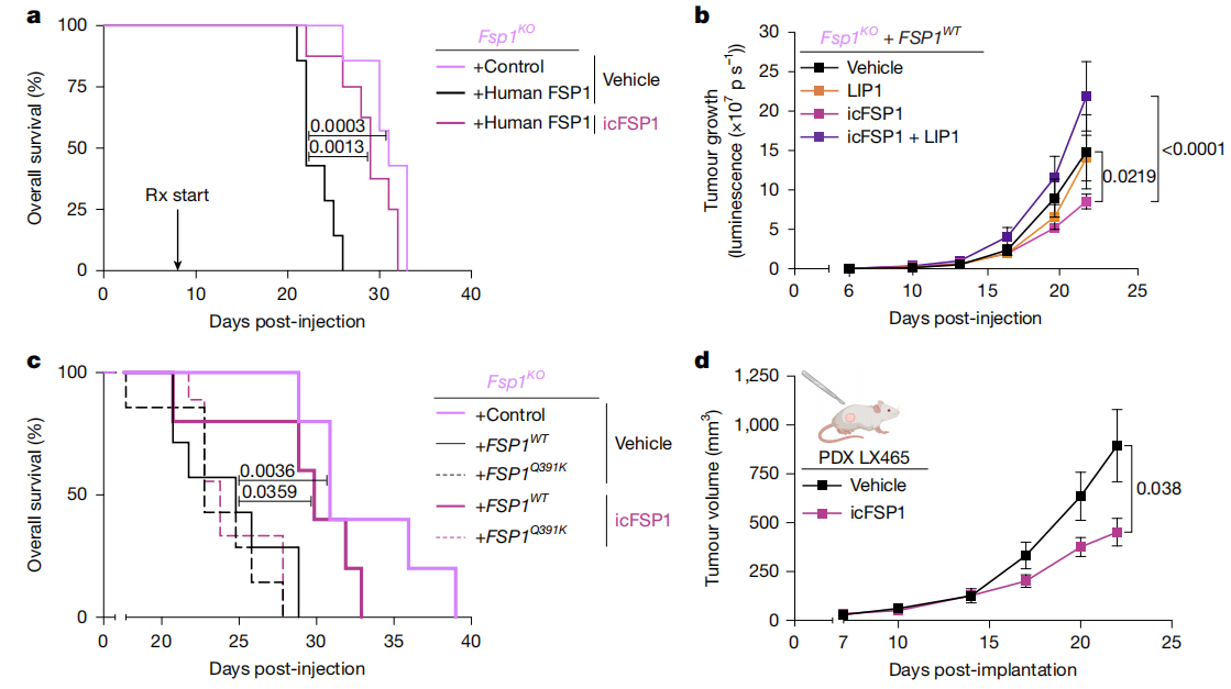 2025年11月,紐約大學團隊在《自然》發表的研究為FSP1的臨床價值提供了直接證據。通過構建肺腺癌基因工程小鼠模型,研究者發現敲除FSP1基因可使腫瘤生長減少80%,脂質過氧化水平顯著升高。更關鍵的是,新型FSP1抑制劑icFSP1在動物實驗中展現出與基因敲除相當的療效,且對正常細胞毒性更低。脂質組學分析顯示,FSP1缺失導致腫瘤內過氧化磷脂(pLPO)積累,而通過飲食補充維生素E或藥物抑制鐵死亡可部分恢復腫瘤生長,證實了FSP1通過抑制鐵死亡促進腫瘤進展的核心機制。